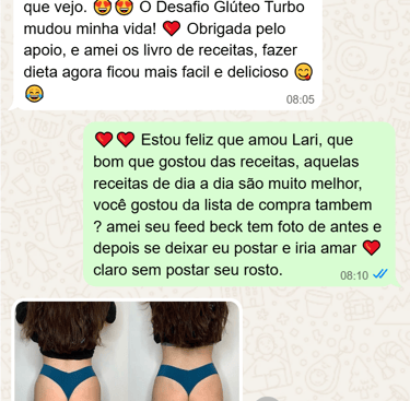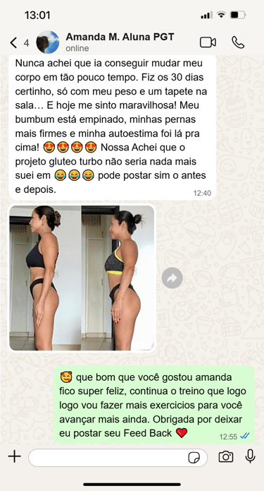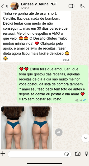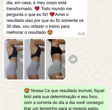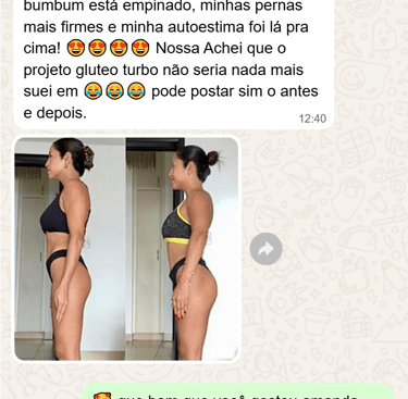 Até que um dia, cansei de acreditar nisso. Decidi fazer algo diferente algo que realmente funcionasse pra mim, com a rotina que eu tinha. Foi aí que nasceu o Projeto Glúteo Turbo 30 Dias. Eu criei esse método pensando em mulheres reais, como eu — que trabalham, cuidam da casa, dos filhos, do marido… e que, mesmo sem tempo, ainda sonham em se sentir bonitas e confiantes novamente.